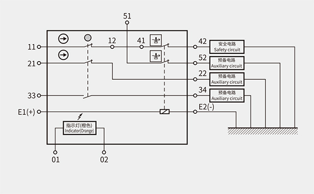 作為安全電路輸入(下述端子11-12、41-42 的冗余電路)使用時,請將21-22、51-52 端子串聯(lián)使用。此外,作為對預備電路的輸入(例如保護門的開關(guān)監(jiān)視:端子21-22,鎖定狀態(tài)的監(jiān)視:端子51-52)使用時,請分別連接使用。